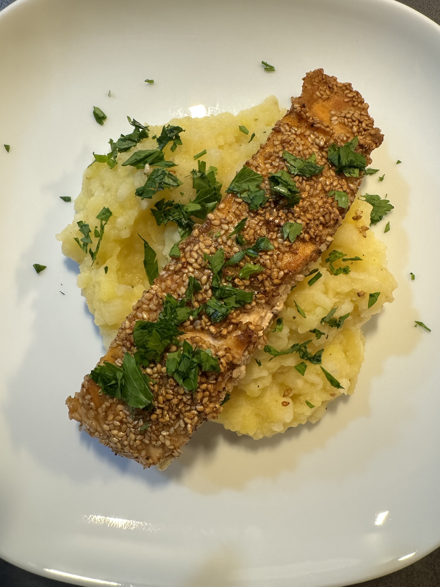 The salmon is baked in the oven with a golden, crispy sesame crust that locks in moisture and adds a nutty crunch. It’s paired with a creamy mash made from a mix of potatoes and parsnips, giving the dish a smooth texture and a naturally sweet twist that surprises and delights. It’s simple enough for a busy weeknight, but elegant enough to feel special.